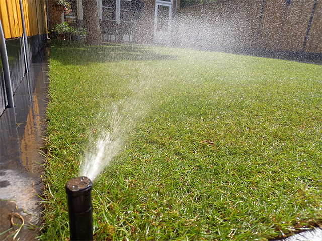 Een installatie waarbij sproeiers vanzelf omhoog komen bij het openstaan van een kraan.